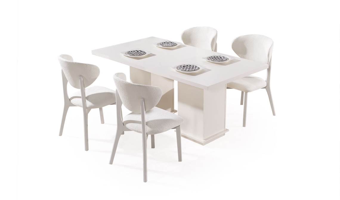 Elegance Yemek Odası, zarif tasarımı ve uyumlu detaylarıyla şık ve davetkâr bir yemek alanı sunar. Fonksiyonel mobilyaları sayesinde hem estetik hem de konforlu bir kullanım sağlar.