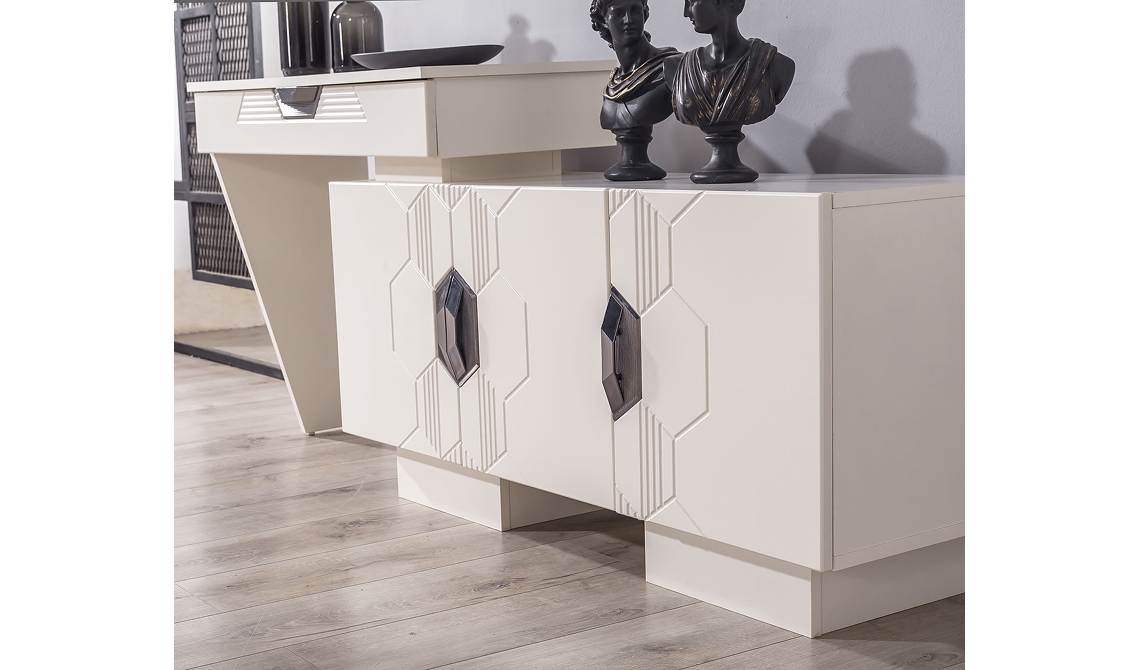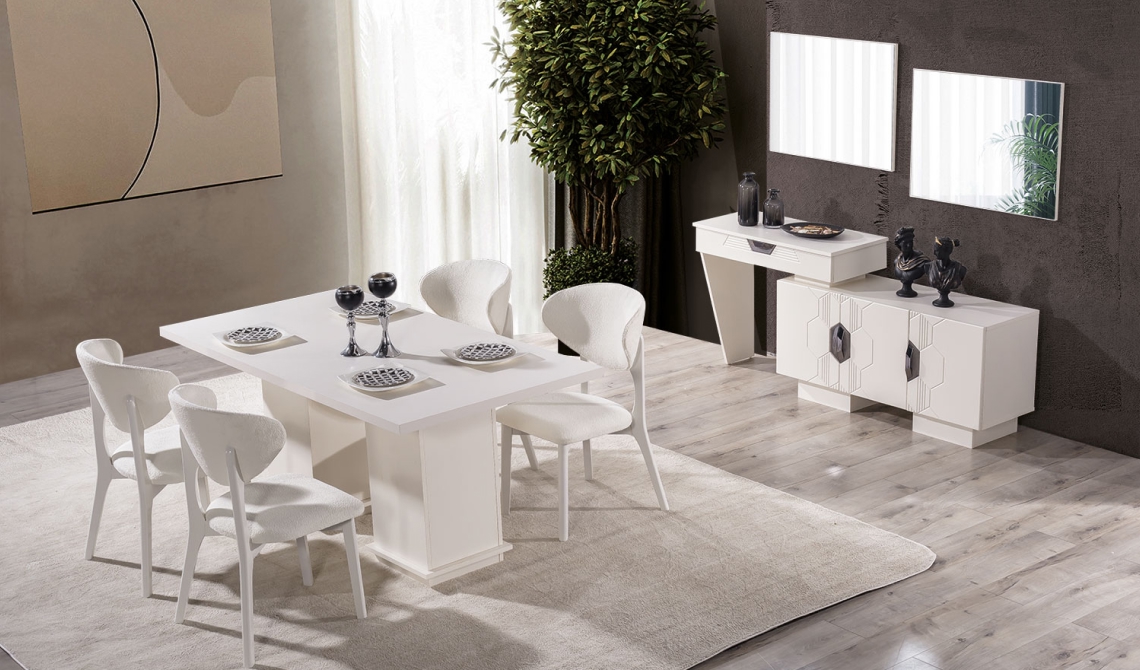 Opal Yemek Odası, modern ve sade tasarımıyla şık ve ferah bir yemek alanı sunar. Uyumlu detayları ve fonksiyonel mobilyalarıyla konforlu bir kullanım sağlar.