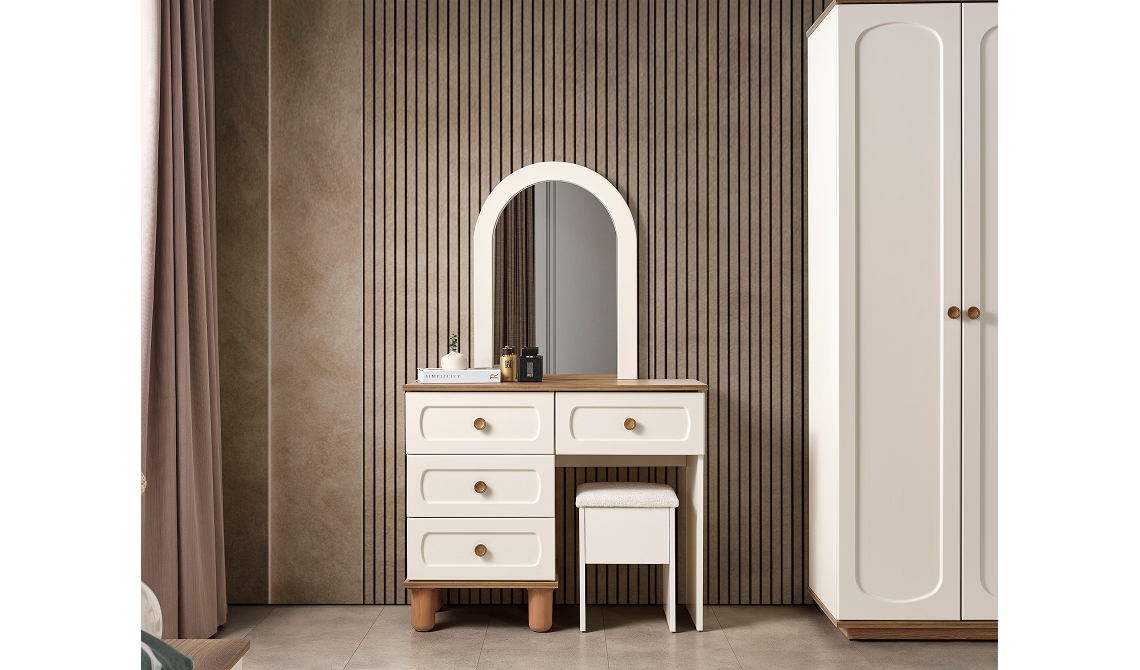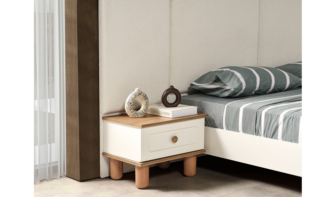 Sude Yatak Odası, sade ve uyumlu tasarımıyla ferah bir yaşam alanı sunar. Fonksiyonel depolama çözümleriyle estetik ve konforu bir arada sağlar.