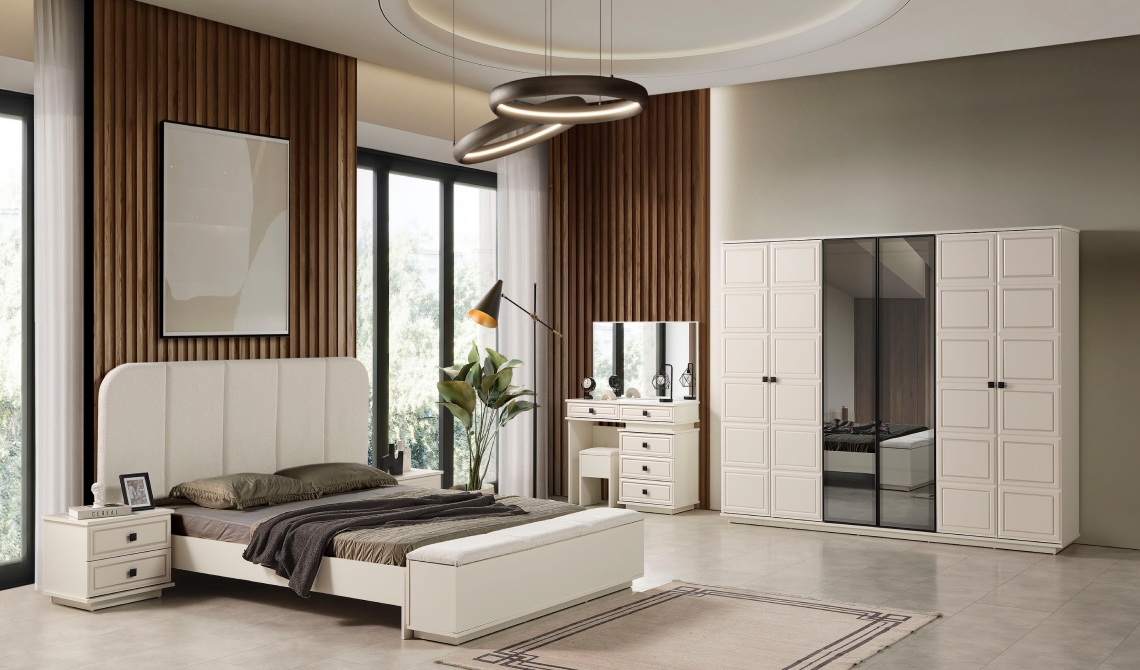 Vizyon Yatak Odası, modern tasarımı ve uyumlu detaylarıyla ferah ve şık bir yaşam alanı sunar. Fonksiyonel depolama çözümleriyle konforu ve estetiği bir arada sağlar.